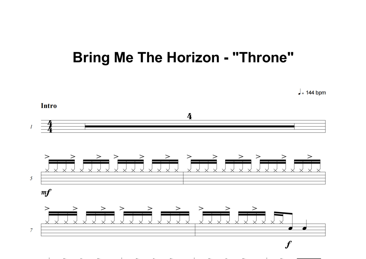 《Throne》是Bring Me The Horizon演唱的一首歌曲,这份架子鼓谱共有五张高清图谱,图谱由 @失眠的土豆 编配上传,图谱使用五线谱编配,使用这份Throne架子鼓谱,你将能够轻松地敲打出这首Bring Me The Horizon的Throne,快来尝试吧。