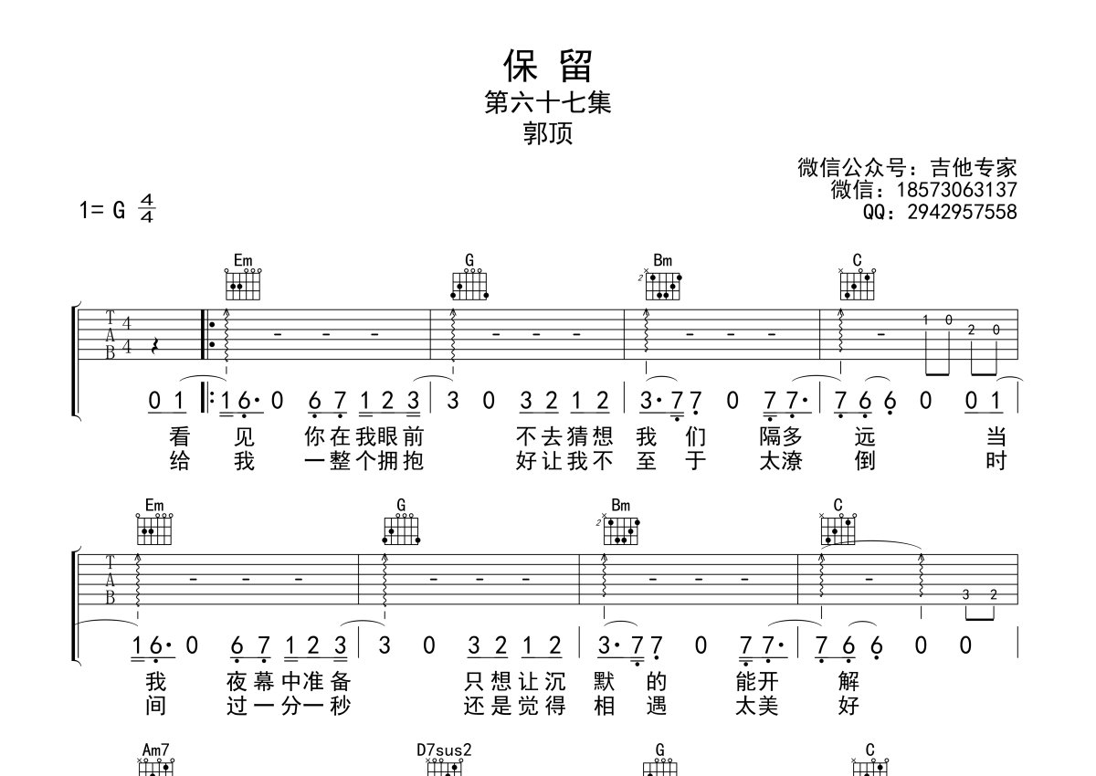 郭顶《保留》吉他谱 - G调弹唱六线谱
