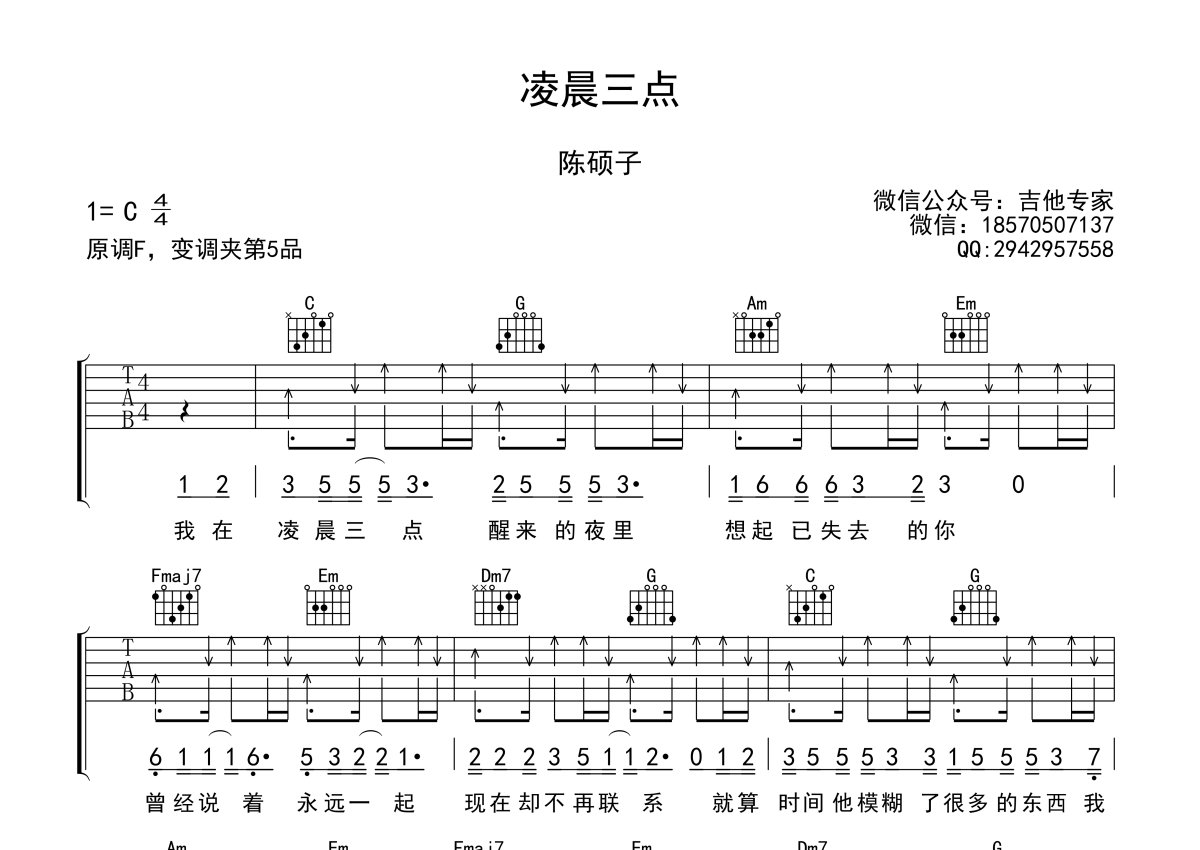 《凌晨三点》是陈硕子演唱的一首歌曲,抖音版,本吉他谱采用的是C调指法编配,这份吉他谱共有两张高清图谱,图谱由 @吉他专家 编配上传,图谱使用六线谱编配,包含吉他和弦指法、简谱以及歌词部分,使用这份凌晨三点吉他谱,可以让你更加方便地掌握这首歌曲的弹唱技巧,快来尝试吧。原调F,变调夹夹五品,选用C调指法。老师编配说明:原本想做一个完整版,可惜已经发布出来的只有副歌一部分。完整版视频因为实在听不太清歌词和旋律,所以以后出吧!凌晨三点,有多少人在那个时间里默默的奋斗,默默的徘徊,默默的感伤, 在这个凌晨三点的夜里,你又在做着什么?。