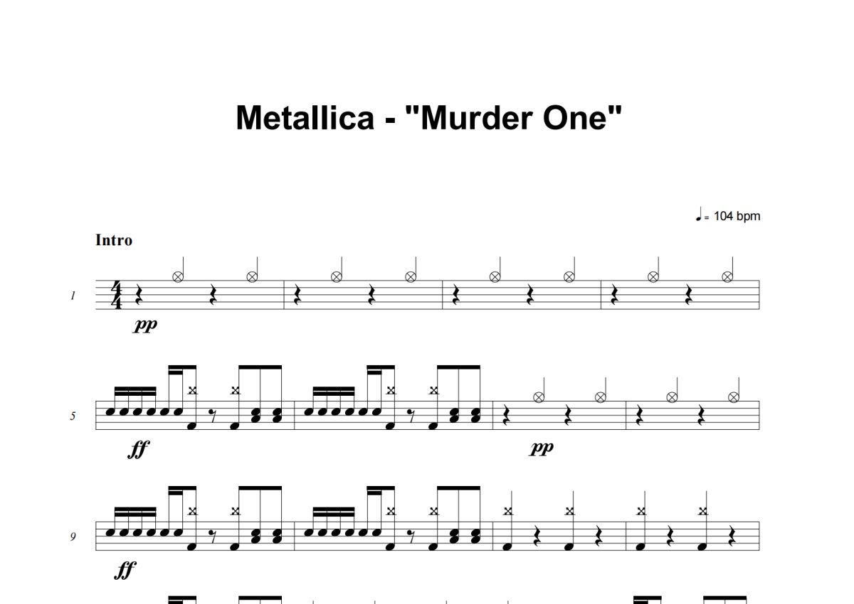 《Murder One》是Metallica演唱的一首歌曲,这份架子鼓谱共有五张高清图谱,图谱由 @失眠的土豆 编配上传,图谱使用五线谱编配,使用这份Murder One架子鼓谱,你将能够轻松地敲打出这首Metallica的Murder One,快来尝试吧。