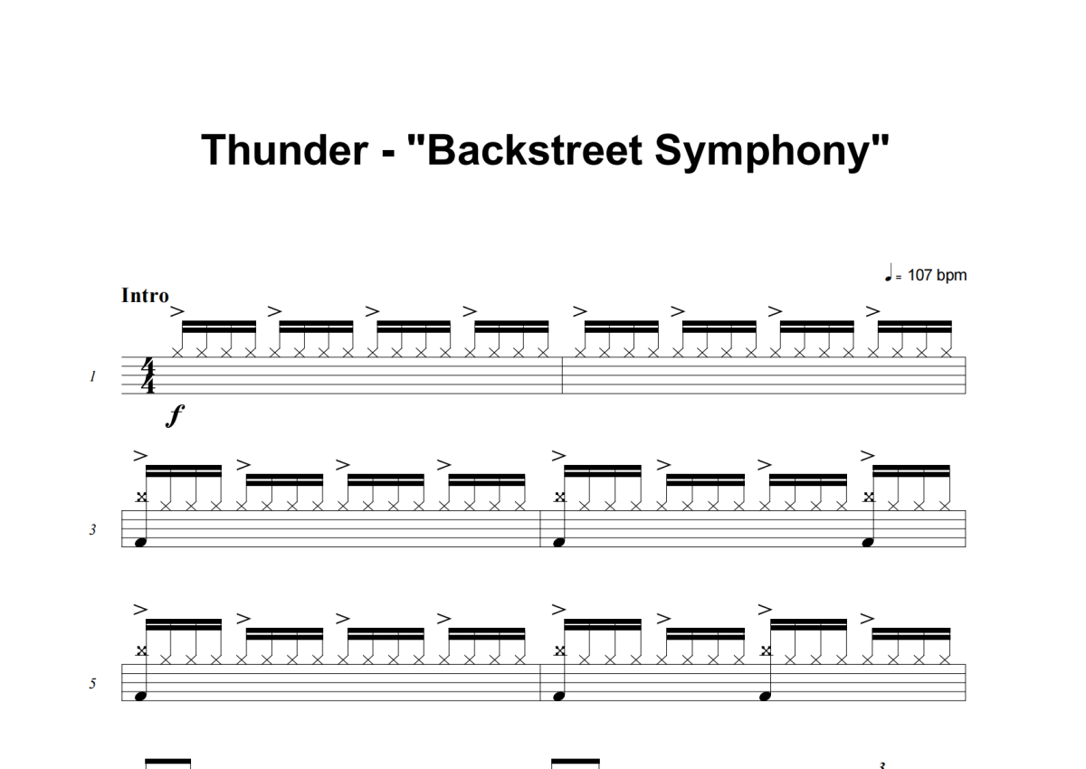 《Backstreet Symphony》是Thunder演唱的一首歌曲,这份架子鼓谱共有五张高清图谱,图谱由 @失眠的土豆 编配上传,图谱使用五线谱编配,使用这份Backstreet Symphony架子鼓谱,你将能够轻松地敲打出这首Thunder的Backstreet Symphony,快来尝试吧。