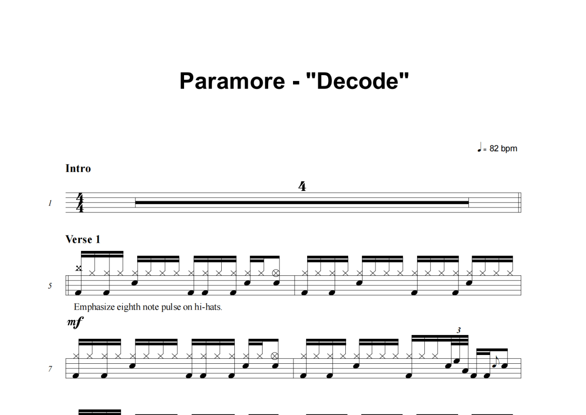 《Decode》是Paramore演唱的一首歌曲,这份架子鼓谱共有五张高清图谱,图谱由 @失眠的土豆 编配上传,图谱使用五线谱编配,使用这份Decode架子鼓谱,你将能够轻松地敲打出这首Paramore的Decode,快来尝试吧。