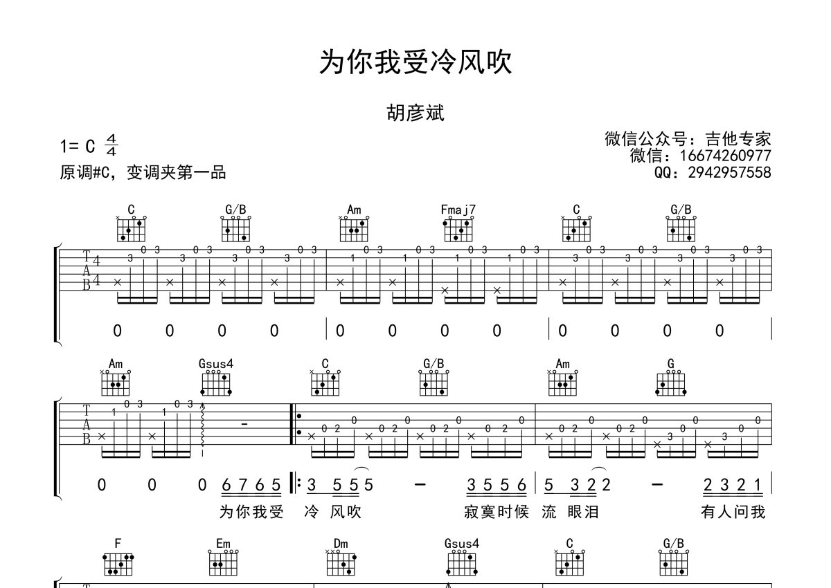 胡彦斌《为你我受冷风吹》吉他谱 - C调弹唱六线谱