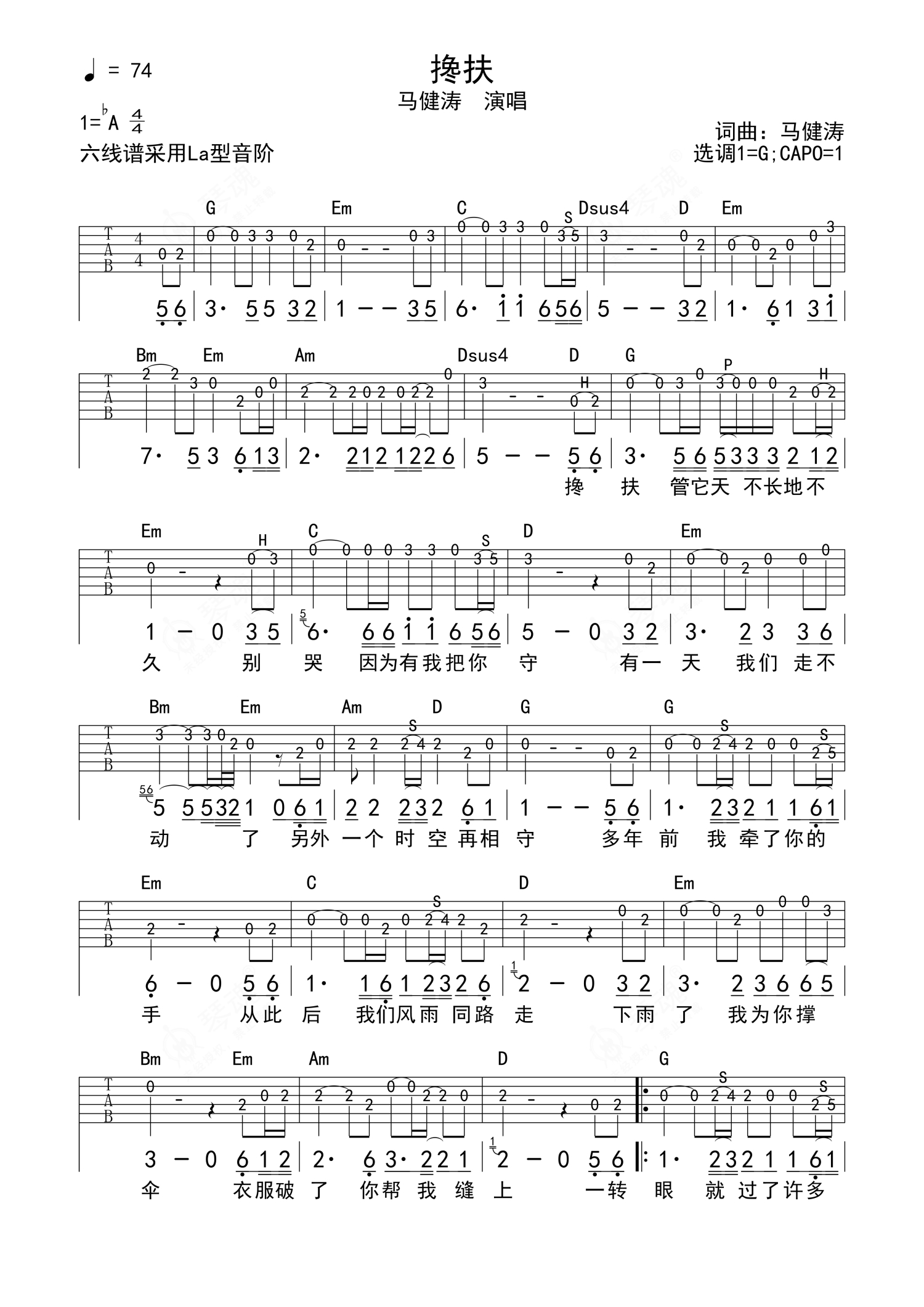搀扶吉他谱 - 马健涛演唱 - G调独奏solo六线谱