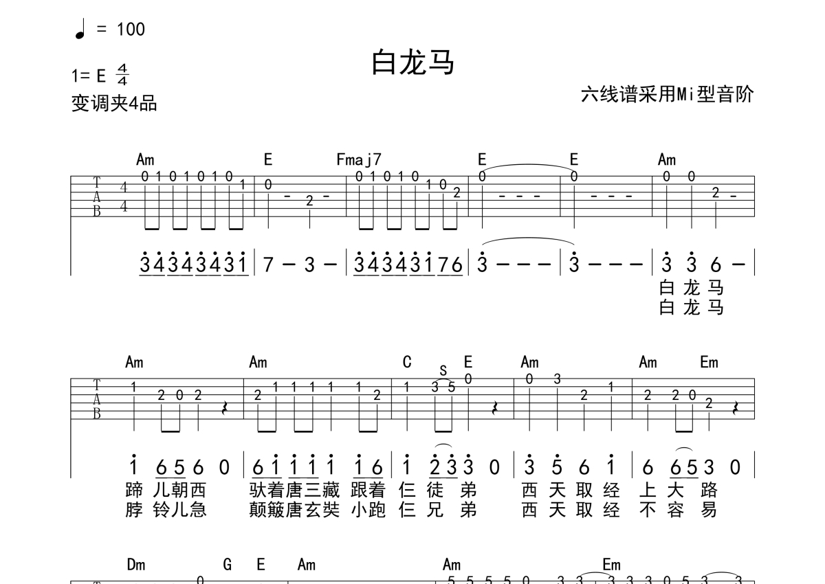 儿童歌曲《白龙马》吉他谱 - C调独奏solo六线谱