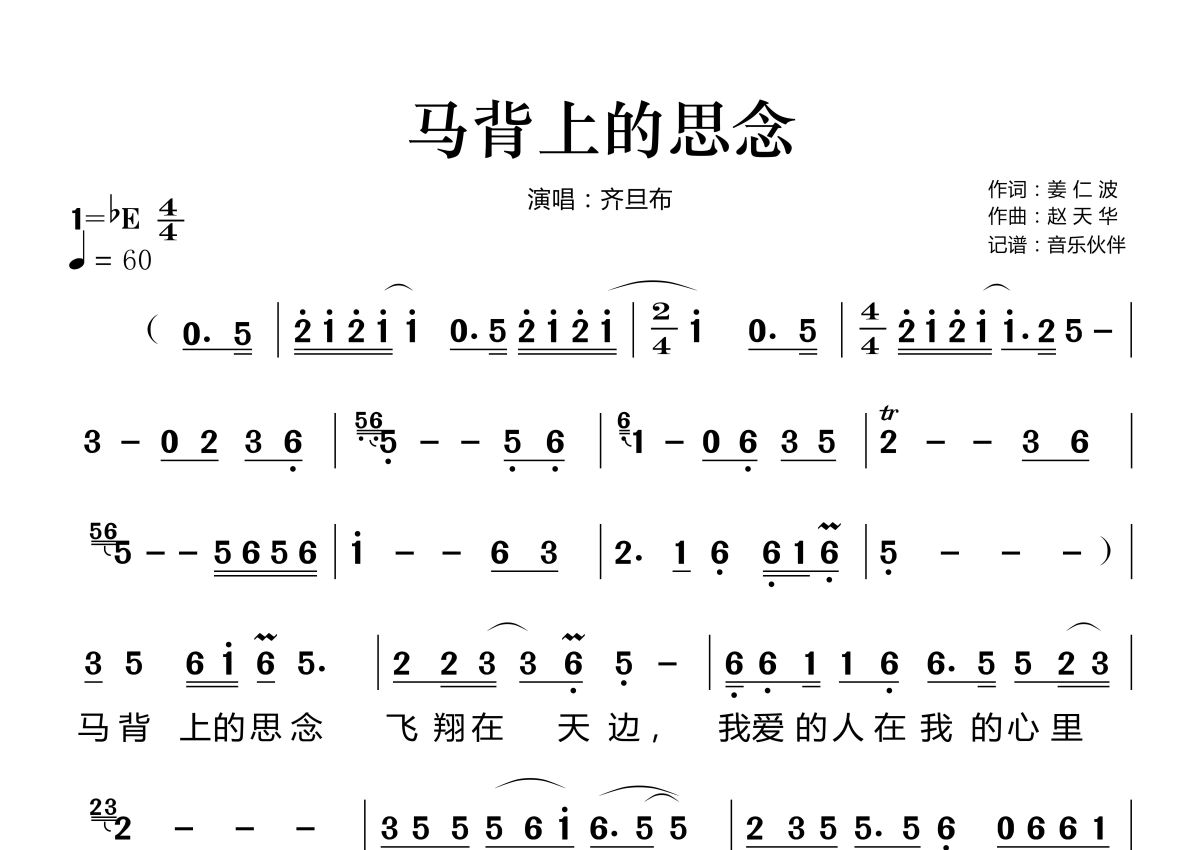 《马背上的思念》是齐旦布演唱的一首歌曲,拍号为4/4拍,歌曲速度为每分钟60拍,这份简谱共有两张高清图谱,图谱由 @音乐伙伴 编配上传。