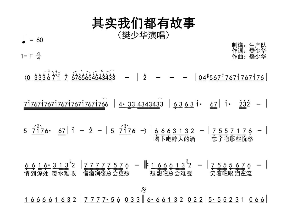《其实我们都有故事》是樊少华演唱的一首歌曲,原版简谱,这份简谱共有一张高清图谱,图谱由 @生产队 编配上传樊少华作词、作曲并演唱的歌曲《其实我们都有故事》原版简谱,含前奏、间奏solo编配,精编完美版,值得推荐!。