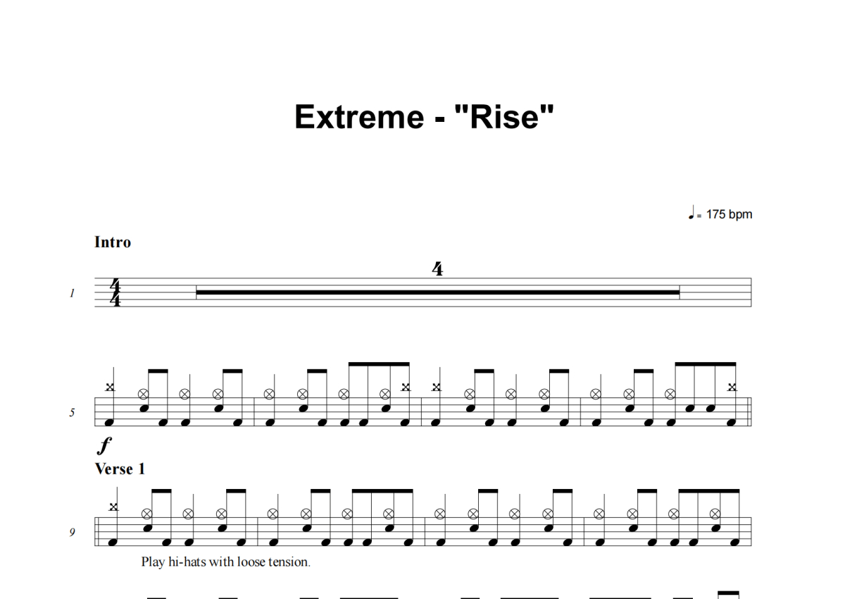 《Rise》是Extreme演唱的一首歌曲,这份架子鼓谱共有六张高清图谱,图谱由 @举个例子 编配上传,图谱使用五线谱编配,使用这份Rise架子鼓谱,你将能够轻松地敲打出这首Extreme的Rise,快来尝试吧。