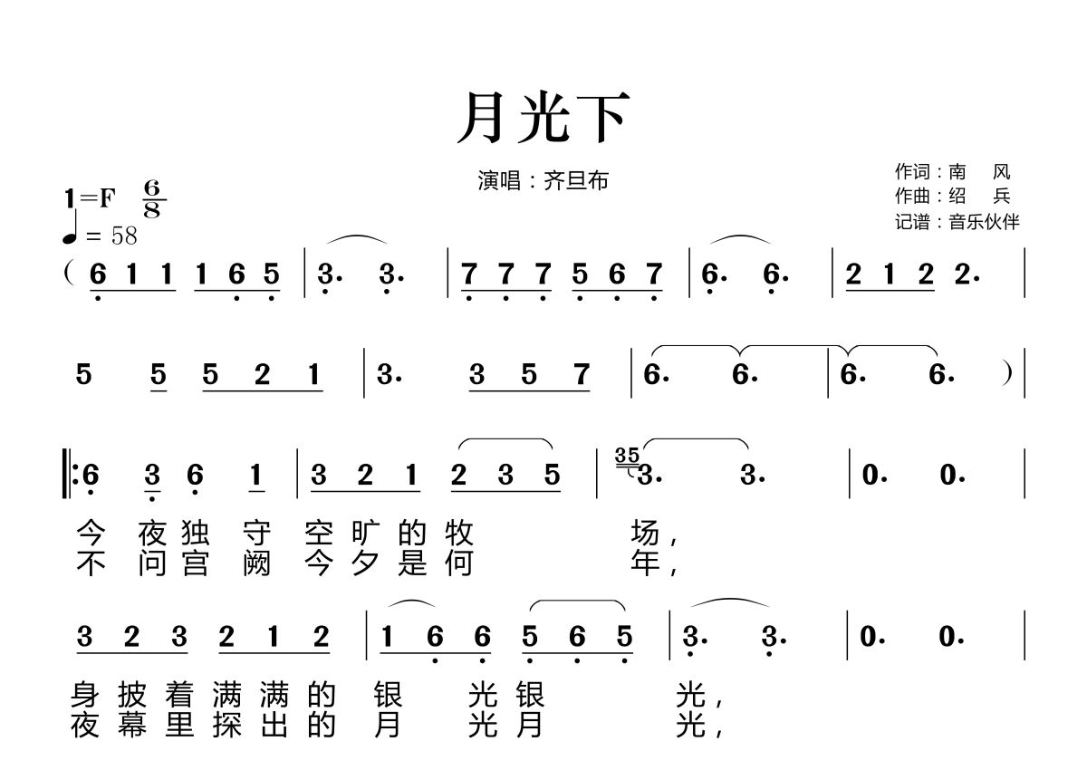 《月光下》是齐旦布演唱的一首歌曲,拍号为6/8拍,歌曲速度为每分钟58拍,这份简谱共有两张高清图谱,图谱由 @音乐伙伴 编配上传。