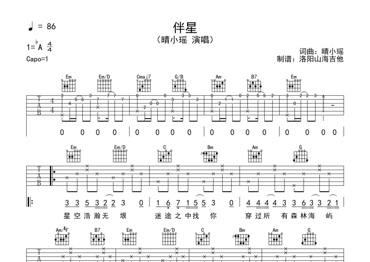 晴小瑶《伴星》吉他谱 - G调弹唱六线谱