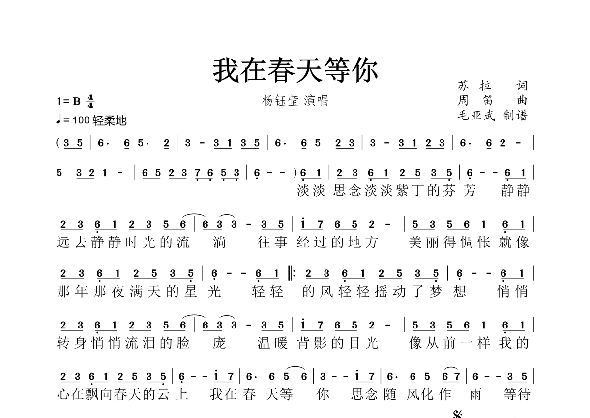 我在春天等你简谱 - 杨钰莹演唱
