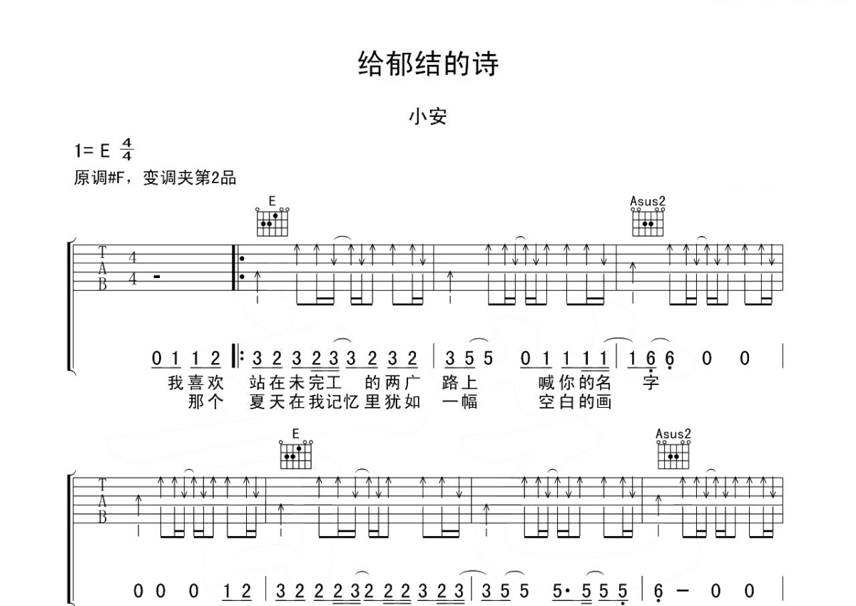 《给郁结的诗》是小安演唱的一首歌曲,本吉他谱采用的是E调指法编配,这份吉他谱共有三张高清图谱,图谱由 @吉他专家 编配上传,图谱使用六线谱编配,包含吉他和弦指法、简谱以及歌词部分,使用这份给郁结的诗吉他谱,可以让你更加方便地掌握这首歌曲的弹唱技巧,快来尝试吧。小安《给郁结的诗》吉他谱,原调#F,变调夹夹第二品,选用E调指法编配,