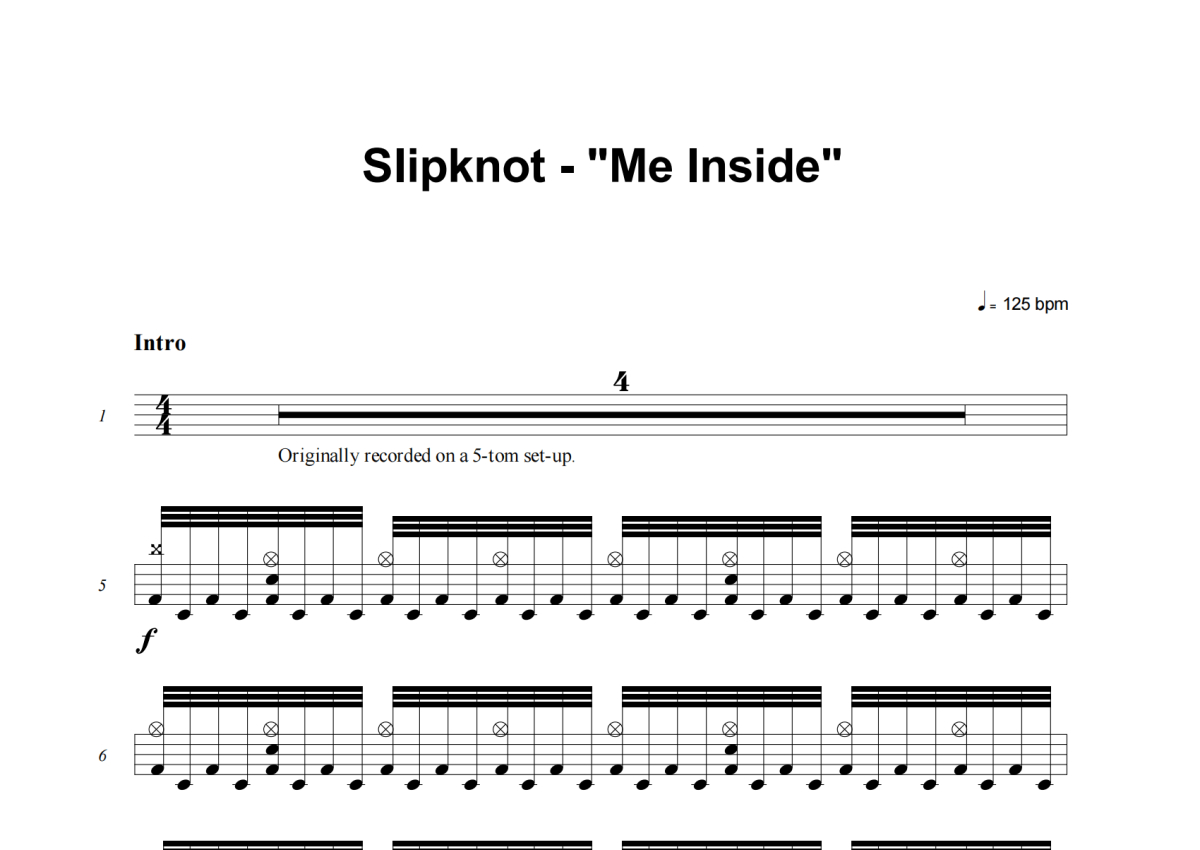 《Me Inside》是Slipknot演唱的一首歌曲,这份架子鼓谱共有五张高清图谱,图谱由 @举个例子 编配上传,图谱使用五线谱编配,使用这份Me Inside架子鼓谱,你将能够轻松地敲打出这首Slipknot的Me Inside,快来尝试吧。