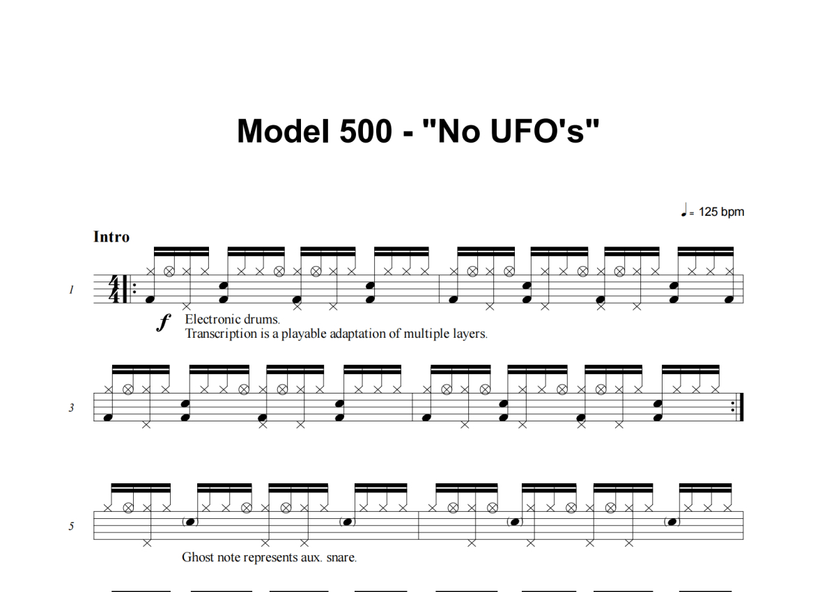 《No UFO's》是Model 500演唱的一首歌曲,这份架子鼓谱共有六张高清图谱,图谱由 @举个例子 编配上传,图谱使用五线谱编配,使用这份No UFO's架子鼓谱,你将能够轻松地敲打出这首Model 500的No UFO's,快来尝试吧。