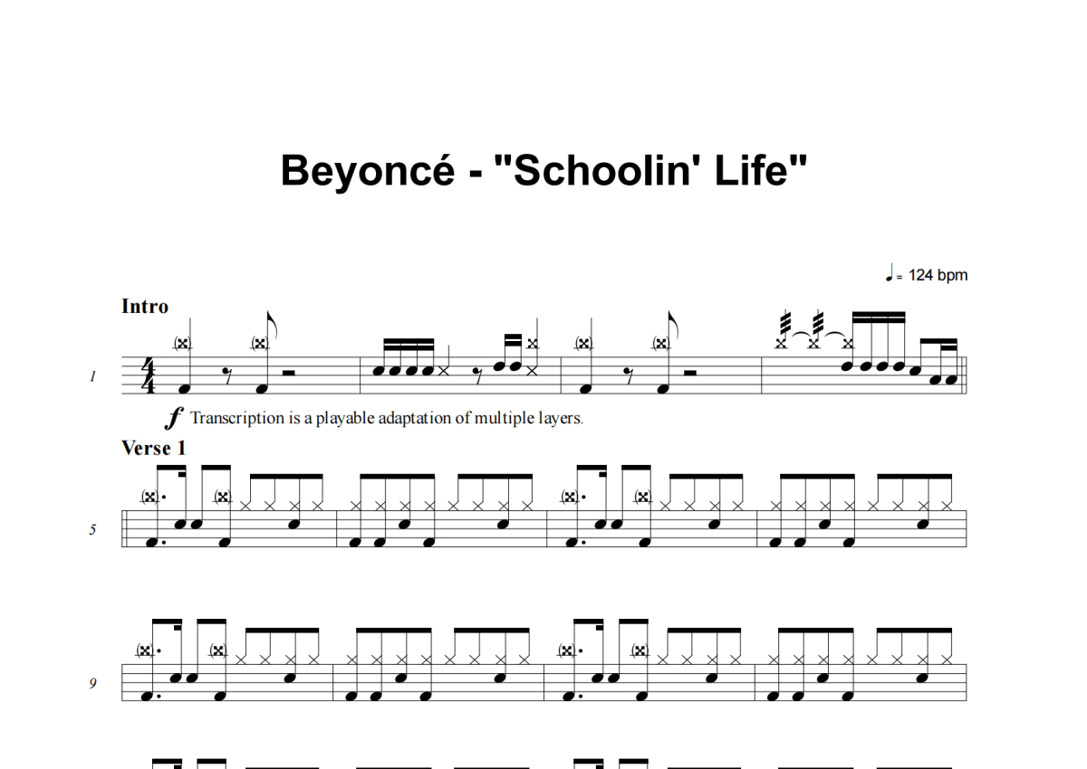 《Schoolin' Life》是Beyonce演唱的一首歌曲,这份架子鼓谱共有四张高清图谱,图谱由 @举个例子 编配上传,图谱使用五线谱编配,使用这份Schoolin' Life架子鼓谱,你将能够轻松地敲打出这首Beyonce的Schoolin' Life,快来尝试吧。