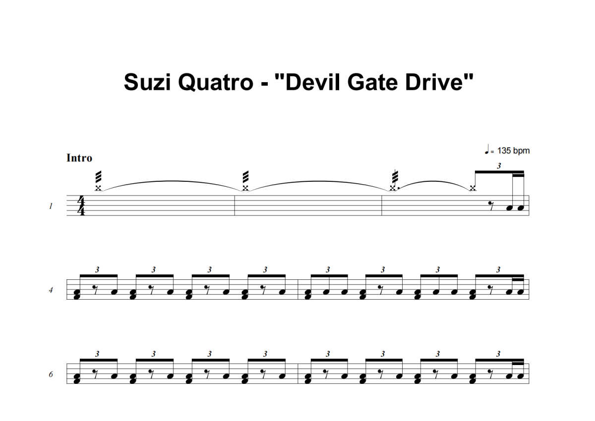 《Devil Gate Drive》是Suzi Quatro演唱的一首歌曲,这份架子鼓谱共有七张高清图谱,图谱由 @举个例子 编配上传,图谱使用五线谱编配,使用这份Devil Gate Drive架子鼓谱,你将能够轻松地敲打出这首Suzi Quatro的Devil Gate Drive,快来尝试吧。