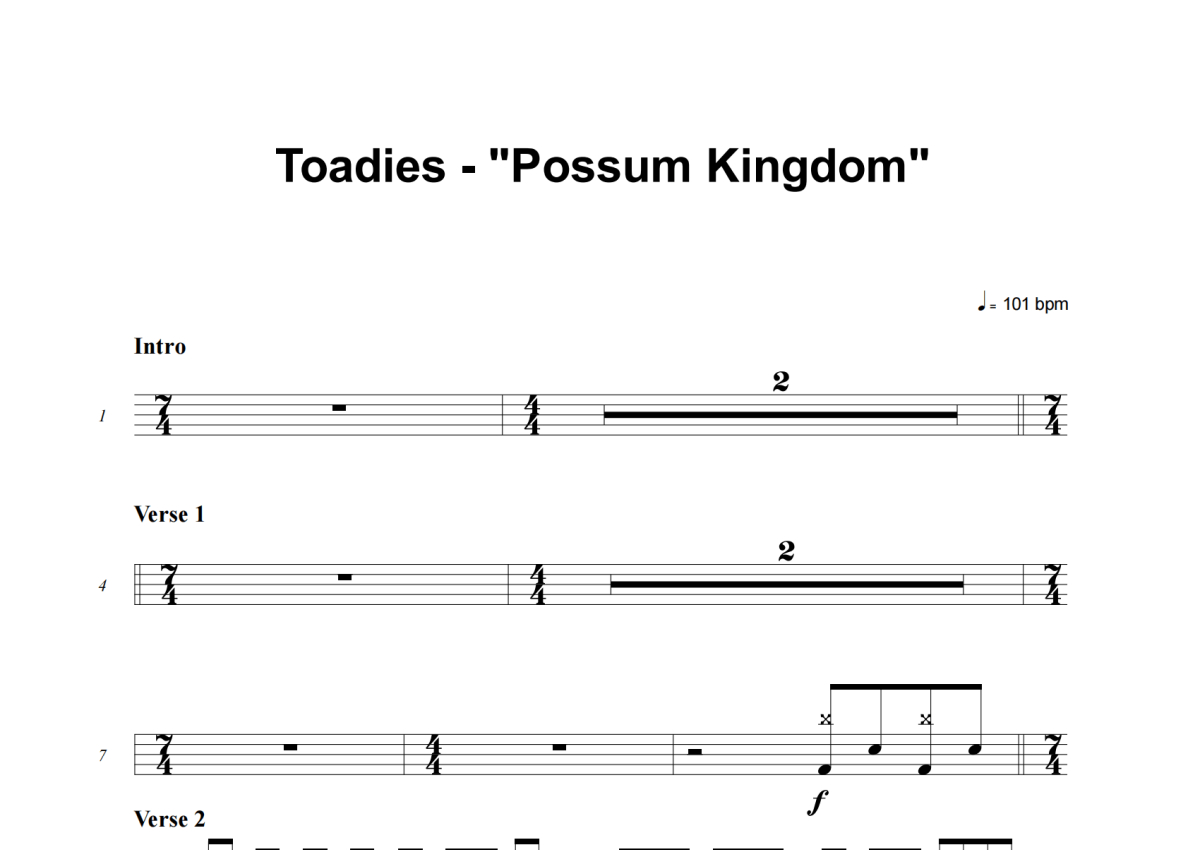 《Possum Kingdom》是Toadies演唱的一首歌曲,这份架子鼓谱共有六张高清图谱,图谱由 @举个例子 编配上传,图谱使用五线谱编配,使用这份Possum Kingdom架子鼓谱,你将能够轻松地敲打出这首Toadies的Possum Kingdom,快来尝试吧。