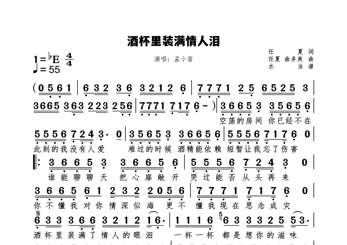 《酒杯里装满情人泪》是孟小笛演唱的一首歌曲,拍号为4/4拍,歌曲速度为每分钟55拍,这份简谱共有一张高清图谱,图谱由 @水当 编配上传原调bE。