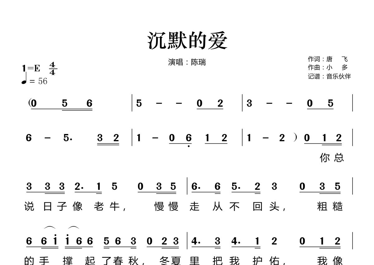 《沉默的爱》是陈瑞演唱的一首歌曲,拍号为4/4拍,歌曲速度为每分钟56拍,这份简谱共有两张高清图谱,图谱由 @音乐伙伴 编配上传。