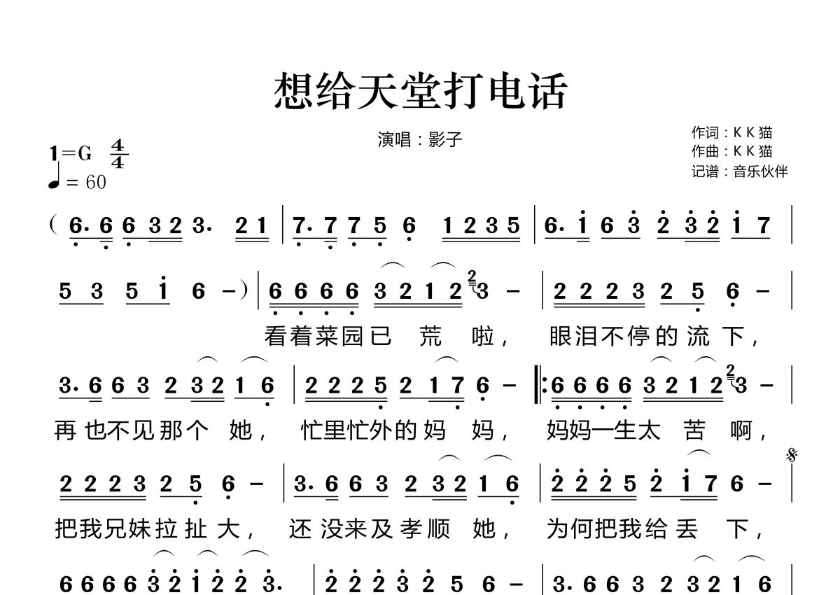 《想给天堂打电话》是影子演唱的一首歌曲,拍号为4/4拍,歌曲速度为每分钟60拍,这份简谱共有一张高清图谱,图谱由 @音乐伙伴 编配上传。