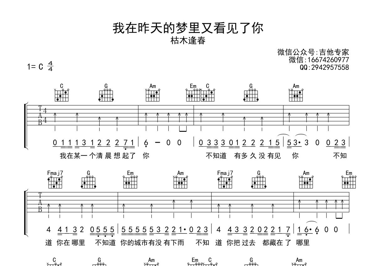 枯木逢春《我在昨天的梦里又看见了你》吉他谱 - C调弹唱六线谱
