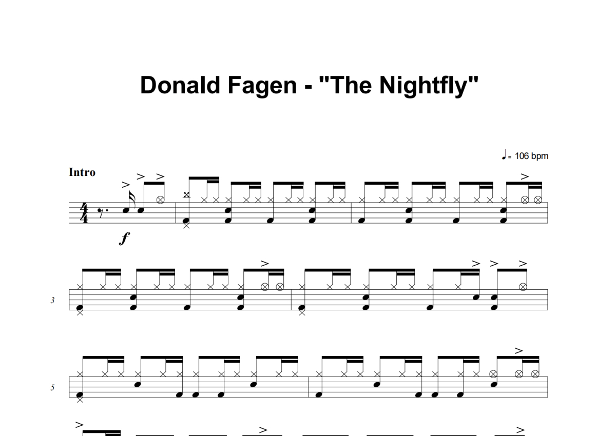 《The Nightfly》是Donald Fagen演唱的一首歌曲,这份架子鼓谱共有八张高清图谱,图谱由 @举个例子 编配上传,图谱使用五线谱编配,使用这份The Nightfly架子鼓谱,你将能够轻松地敲打出这首Donald Fagen的The Nightfly,快来尝试吧。