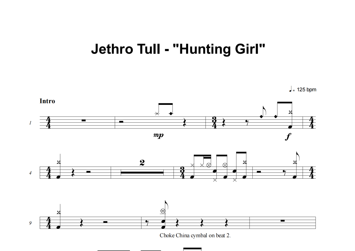 《Hunting Girl》是Jethro Tull演唱的一首歌曲,这份架子鼓谱共有六张高清图谱,图谱由 @举个例子 编配上传,图谱使用五线谱编配,使用这份Hunting Girl架子鼓谱,你将能够轻松地敲打出这首Jethro Tull的Hunting Girl,快来尝试吧。