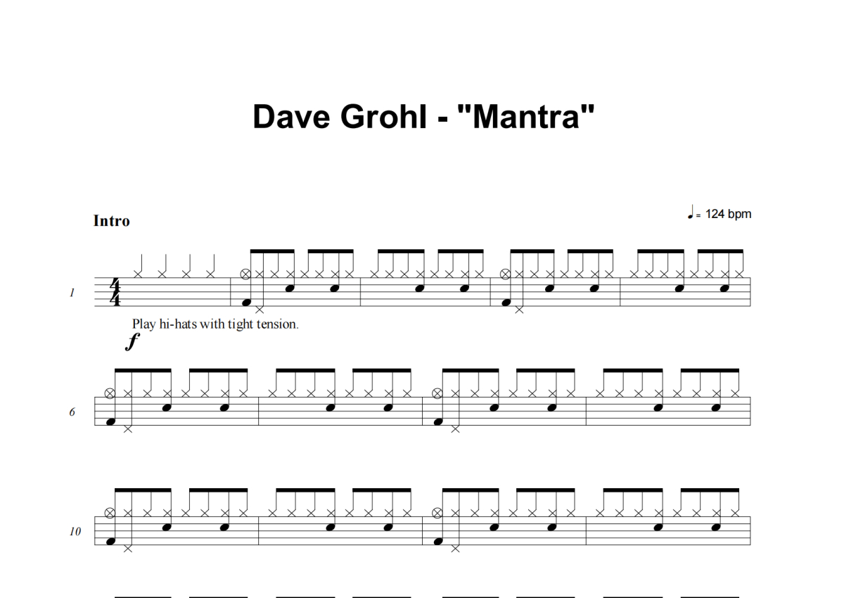 《Mantra》是Dave Grohl Josh Homme & Trent Reznor演唱的一首歌曲,这份架子鼓谱共有七张高清图谱,图谱由 @举个例子 编配上传,图谱使用五线谱编配,使用这份Mantra架子鼓谱,你将能够轻松地敲打出这首Dave Grohl Josh Homme & Trent Reznor的Mantra,快来尝试吧。