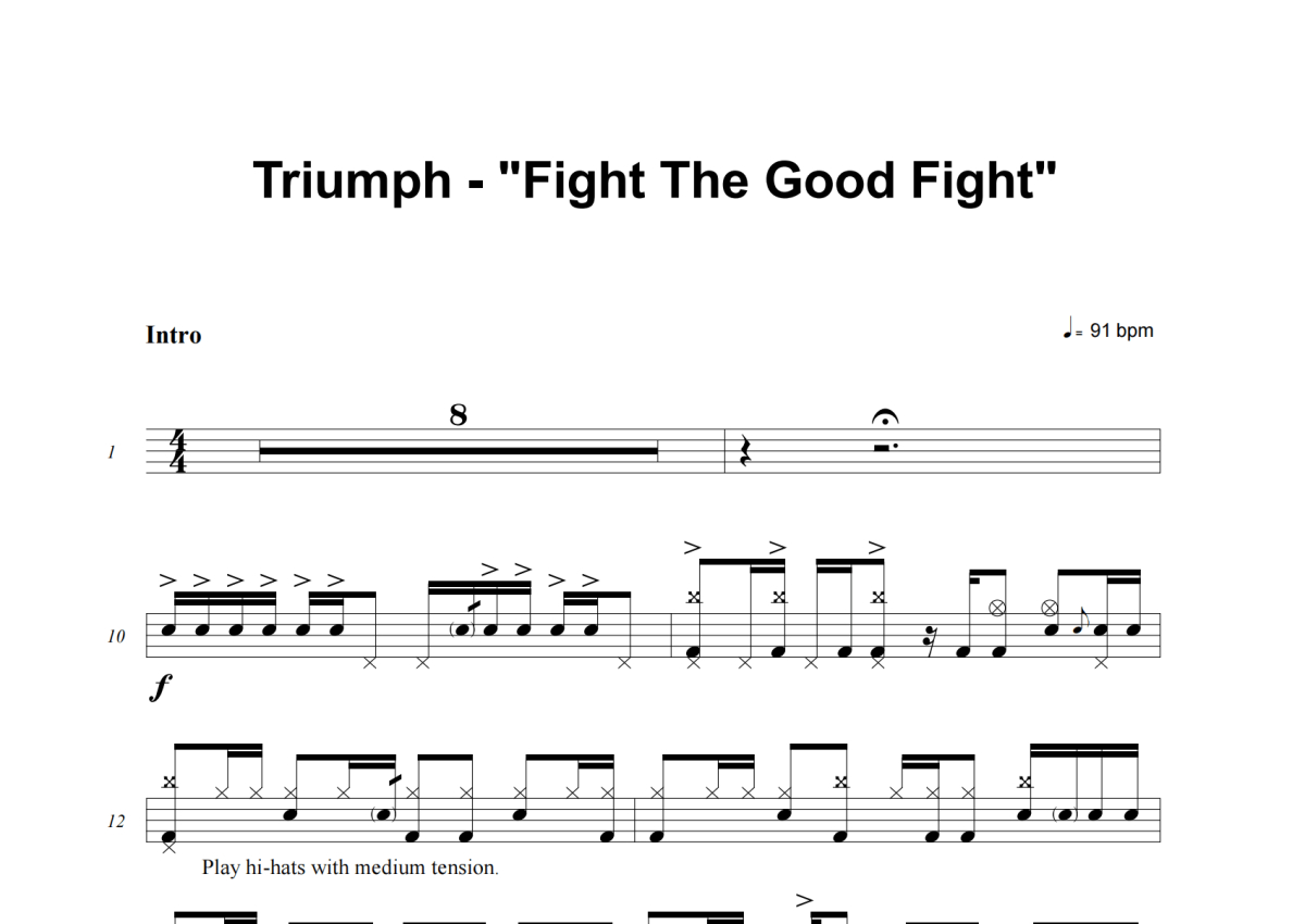 《Fight The Good Fight》是Triumph演唱的一首歌曲,这份架子鼓谱共有七张高清图谱,图谱由 @举个例子 编配上传,图谱使用五线谱编配,使用这份Fight The Good Fight架子鼓谱,你将能够轻松地敲打出这首Triumph的Fight The Good Fight,快来尝试吧。