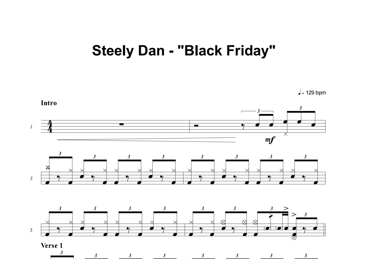 《Black Friday》是Steely Dan演唱的一首歌曲,这份架子鼓谱共有七张高清图谱,图谱由 @举个例子 编配上传,图谱使用五线谱编配,使用这份Black Friday架子鼓谱,你将能够轻松地敲打出这首Steely Dan的Black Friday,快来尝试吧。