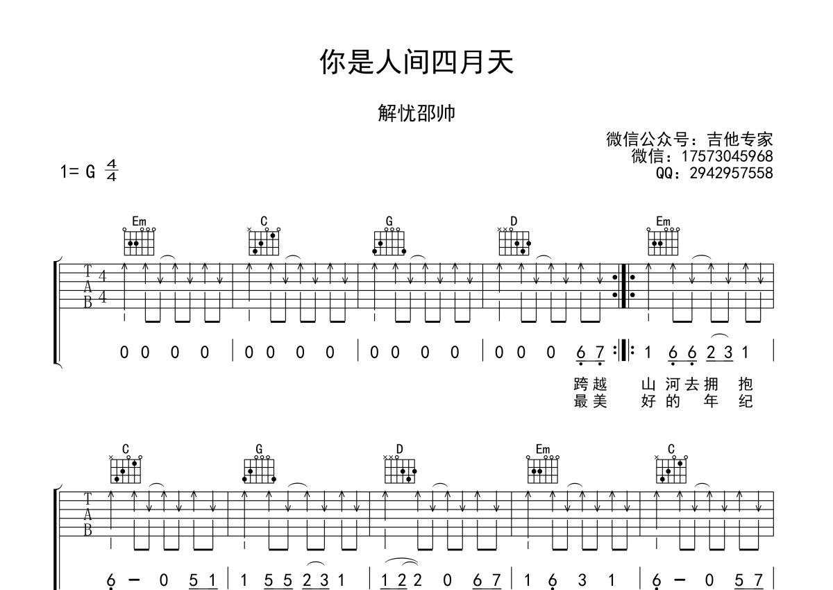 解忧邵帅《你是人间四月天》吉他谱 - G调弹唱六线谱