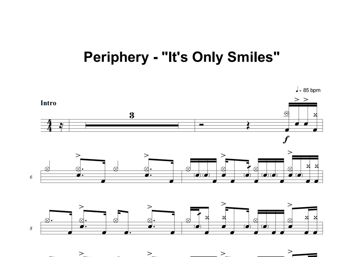 《It's Only Smiles》是Periphery演唱的一首歌曲,这份架子鼓谱共有六张高清图谱,图谱由 @举个例子 编配上传,图谱使用五线谱编配,使用这份It's Only Smiles架子鼓谱,你将能够轻松地敲打出这首Periphery的It's Only Smiles,快来尝试吧。