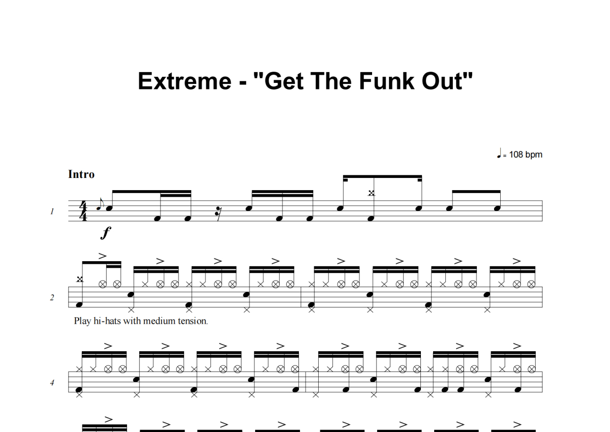《Get The Funk Out》是Extreme演唱的一首歌曲,这份架子鼓谱共有七张高清图谱,图谱由 @失眠的土豆 编配上传,图谱使用五线谱编配,使用这份Get The Funk Out架子鼓谱,你将能够轻松地敲打出这首Extreme的Get The Funk Out,快来尝试吧。