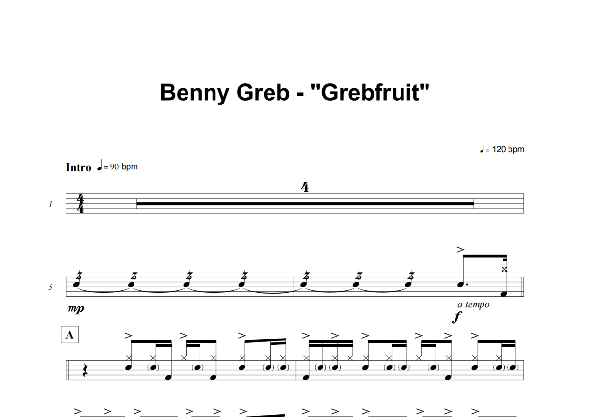 《Grebfruit》是Benny Greb演唱的一首歌曲,这份架子鼓谱共有九张高清图谱,图谱由 @失眠的土豆 编配上传,图谱使用五线谱编配,使用这份Grebfruit架子鼓谱,你将能够轻松地敲打出这首Benny Greb的Grebfruit,快来尝试吧。