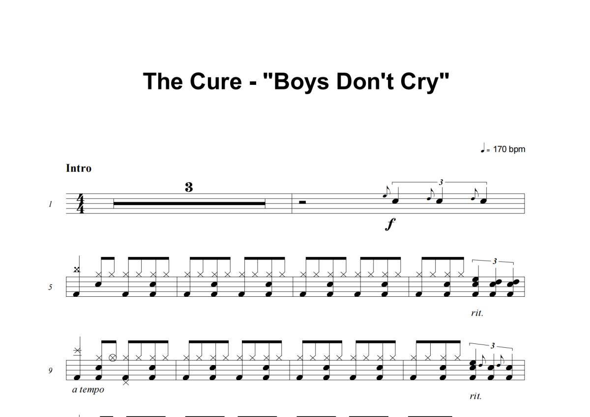 《Boys Don't Cry》是The Cure演唱的一首歌曲,这份架子鼓谱共有四张高清图谱,图谱由 @失眠的土豆 编配上传,图谱使用五线谱编配,使用这份Boys Don't Cry架子鼓谱,你将能够轻松地敲打出这首The Cure的Boys Don't Cry,快来尝试吧。