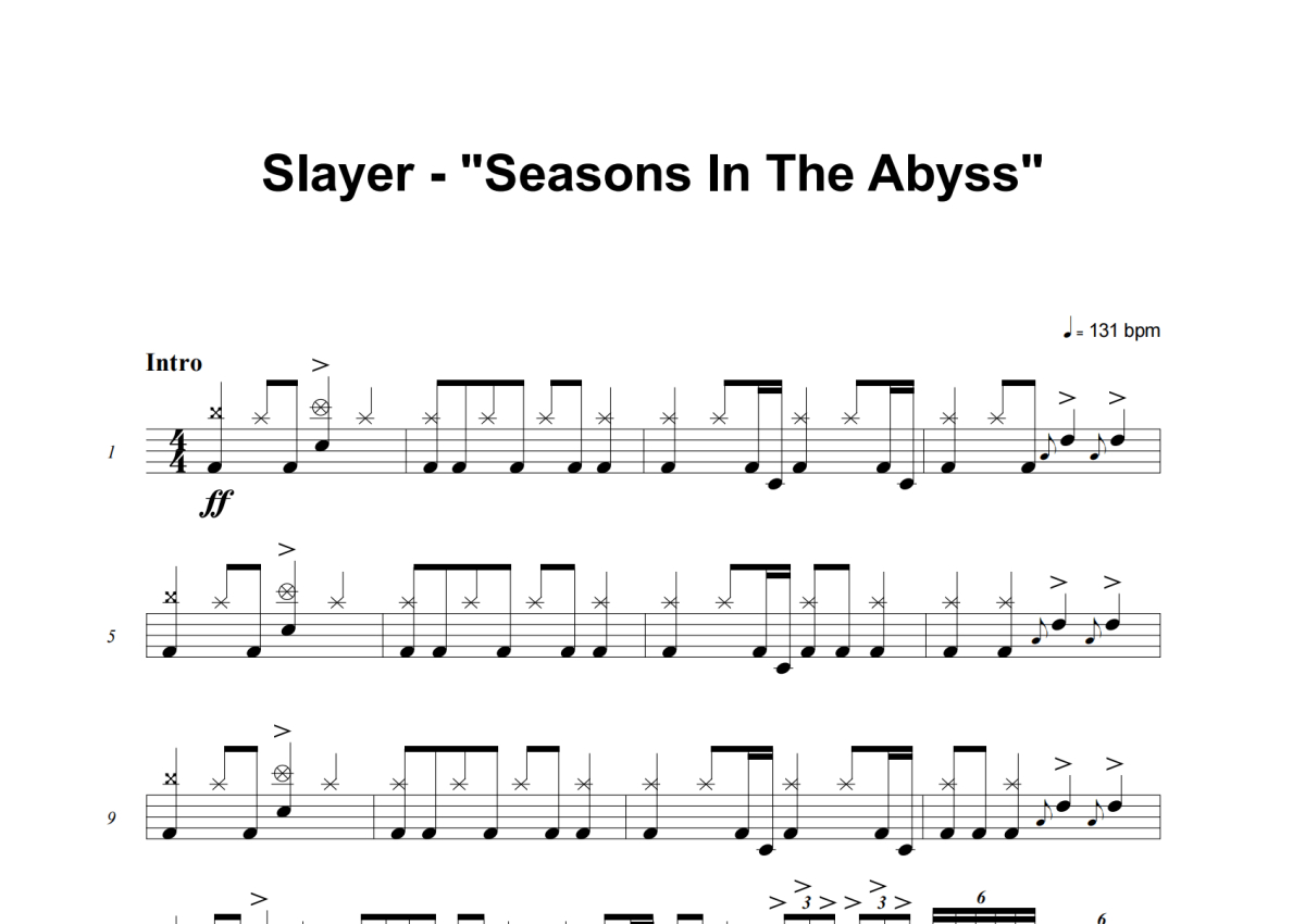 《Season In The Abyss》是Slayer演唱的一首歌曲,这份架子鼓谱共有八张高清图谱,图谱由 @失眠的土豆 编配上传,图谱使用五线谱编配,使用这份Season In The Abyss架子鼓谱,你将能够轻松地敲打出这首Slayer的Season In The Abyss,快来尝试吧。