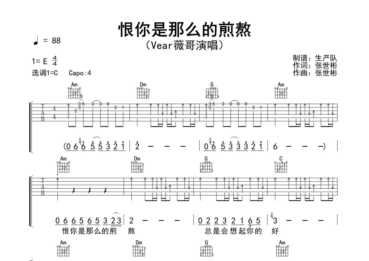 《恨你是那么的煎熬》是Vear薇哥演唱的一首歌曲,精编完美版,拍号为4/4拍,歌曲速度为每分钟88拍,歌曲原调为E调,但由于原调指法比较难,为了方便弹奏,本吉他谱采用的是C调指法编配,变调夹4品弹奏即为原调,当然也可以根据自己的音域改变变调夹位置,或者通过改变和弦调性,以方便自己弹奏,这份吉他谱共有两张高清图谱,图谱由 @生产队 编配上传,图谱使用六线谱编配,包含吉他和弦指法、简谱以及歌词部分,使用这份恨你是那么的煎熬吉他谱,可以让你更加方便地掌握这首歌曲的弹唱技巧,快来尝试吧。Vear薇哥演唱的歌曲《恨你是那么的煎熬》原版吉他谱,含前奏、间奏、尾奏solo编配,精编完美版,值得推荐。