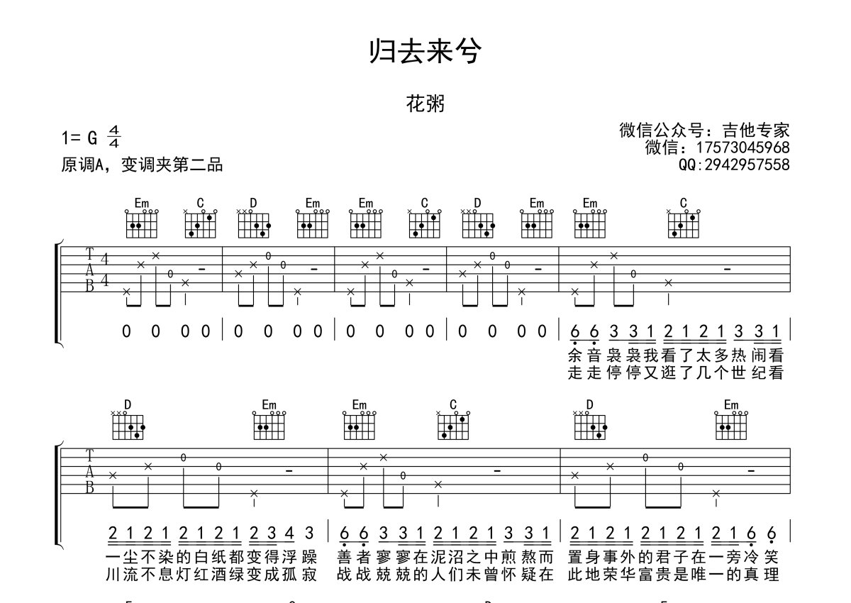 《归去来兮》是花粥演唱的一首歌曲,本吉他谱采用的是G调指法编配,这份吉他谱共有两张高清图谱,图谱由 @吉他专家 编配上传,图谱使用六线谱编配,包含吉他和弦指法、简谱以及歌词部分,使用这份归去来兮吉他谱,可以让你更加方便地掌握这首歌曲的弹唱技巧,快来尝试吧。