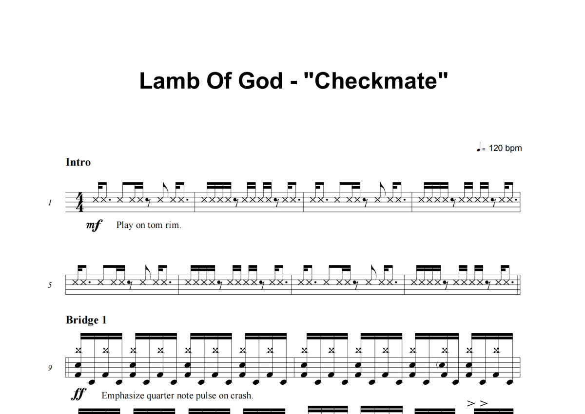 《Checkmate》是Lamb Of God演唱的一首歌曲,这份架子鼓谱共有七张高清图谱,图谱由 @失眠的土豆 编配上传,图谱使用五线谱编配,使用这份Checkmate架子鼓谱,你将能够轻松地敲打出这首Lamb Of God的Checkmate,快来尝试吧。