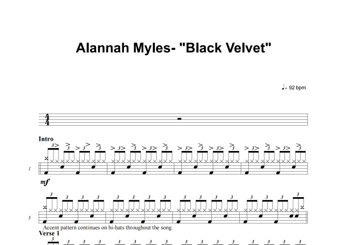 《Black Velvet》是Allanah Myles演唱的一首歌曲,这份架子鼓谱共有四张高清图谱,图谱由 @失眠的土豆 编配上传,图谱使用五线谱编配,使用这份Black Velvet架子鼓谱,你将能够轻松地敲打出这首Allanah Myles的Black Velvet,快来尝试吧。