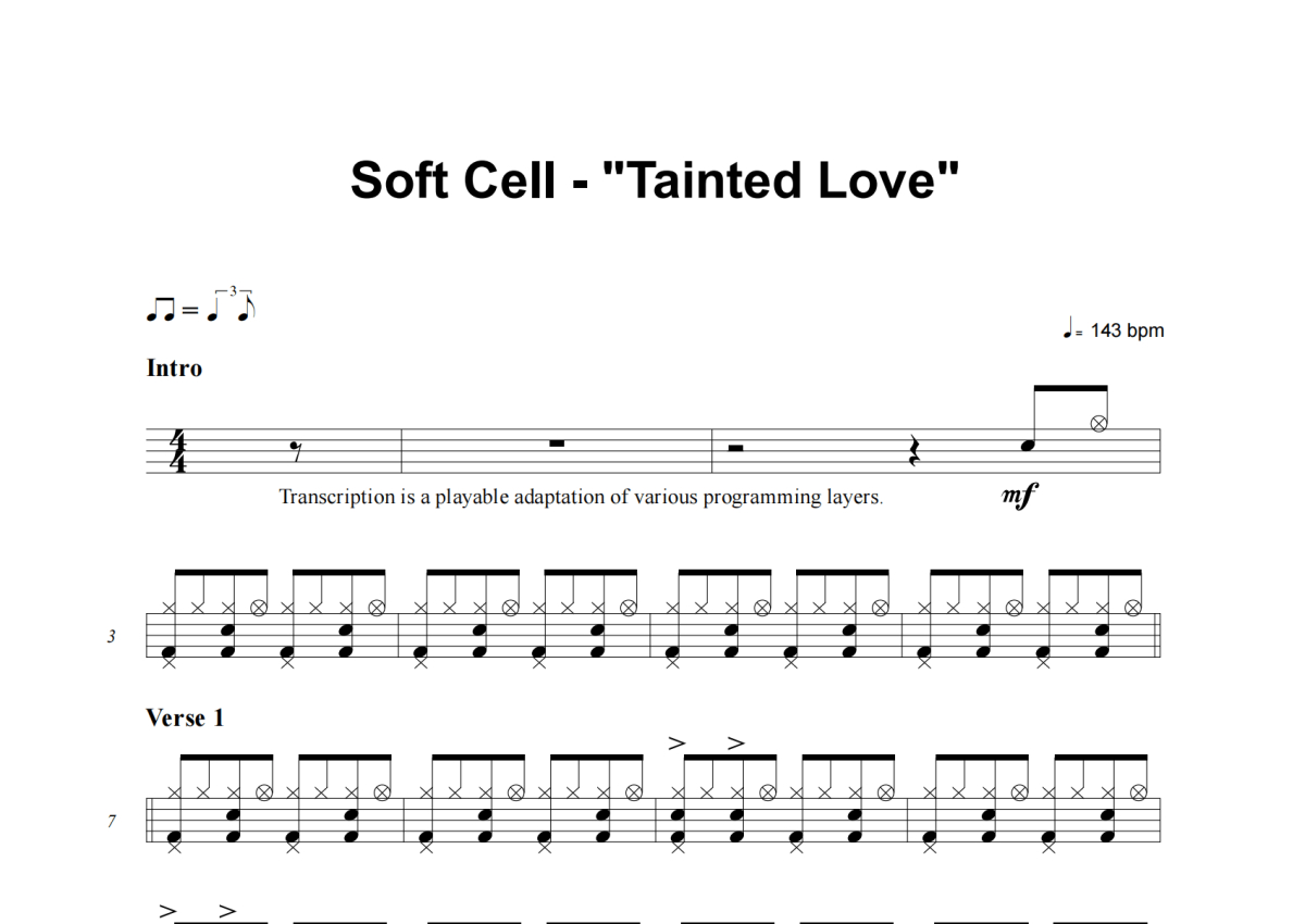 《Tainted Love》是Soft Cell演唱的一首歌曲,这份架子鼓谱共有四张高清图谱,图谱由 @失眠的土豆 编配上传,图谱使用五线谱编配,使用这份Tainted Love架子鼓谱,你将能够轻松地敲打出这首Soft Cell的Tainted Love,快来尝试吧。