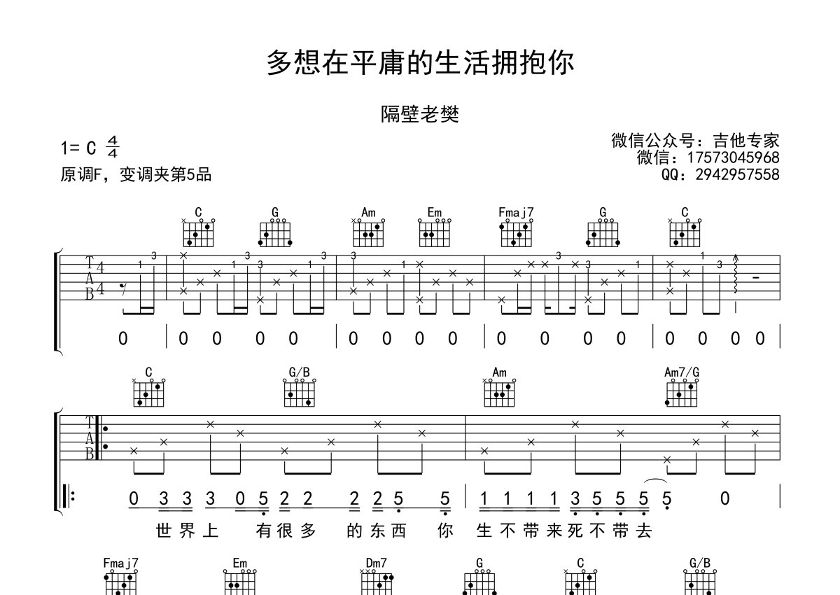 《多想在平庸的生活拥抱你》是隔壁老樊演唱的一首歌曲,本吉他谱采用的是C调指法编配,这份吉他谱共有两张高清图谱,图谱由 @吉他专家 编配上传,图谱使用六线谱编配,包含吉他和弦指法、简谱以及歌词部分,使用这份多想在平庸的生活拥抱你吉他谱,可以让你更加方便地掌握这首歌曲的弹唱技巧,快来尝试吧。隔壁老樊《多想在平庸的生活拥抱你》吉他谱_C调吉他弹唱谱。