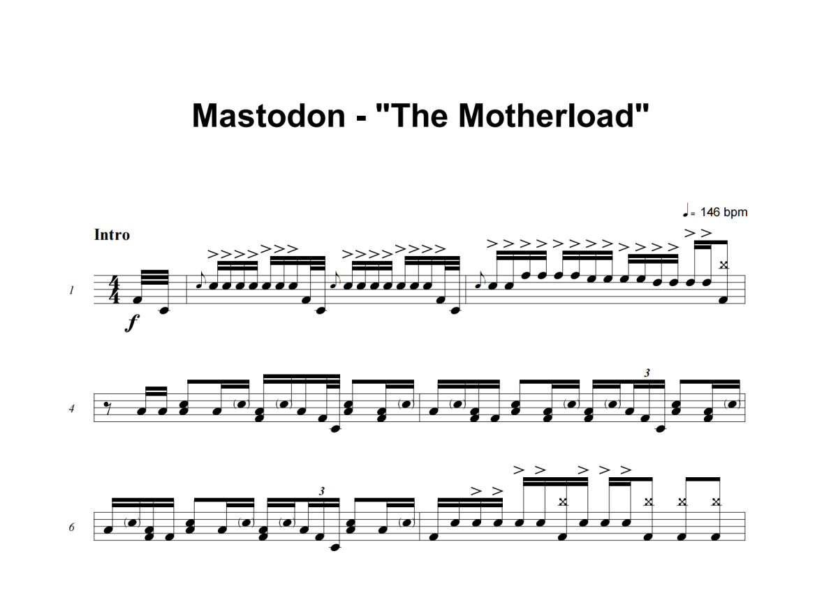 《The Motherload》是Mastodon演唱的一首歌曲,这份架子鼓谱共有十一张高清图谱,图谱由 @失眠的土豆 编配上传,图谱使用五线谱编配,使用这份The Motherload架子鼓谱,你将能够轻松地敲打出这首Mastodon的The Motherload,快来尝试吧。