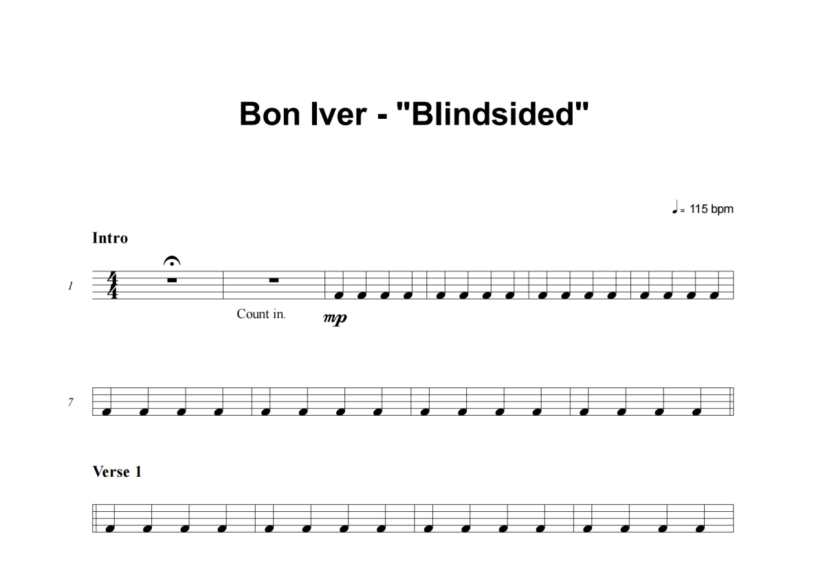 《Blindsided》是Bon Iver演唱的一首歌曲,这份架子鼓谱共有四张高清图谱,图谱由 @失眠的土豆 编配上传,图谱使用五线谱编配,使用这份Blindsided架子鼓谱,你将能够轻松地敲打出这首Bon Iver的Blindsided,快来尝试吧。