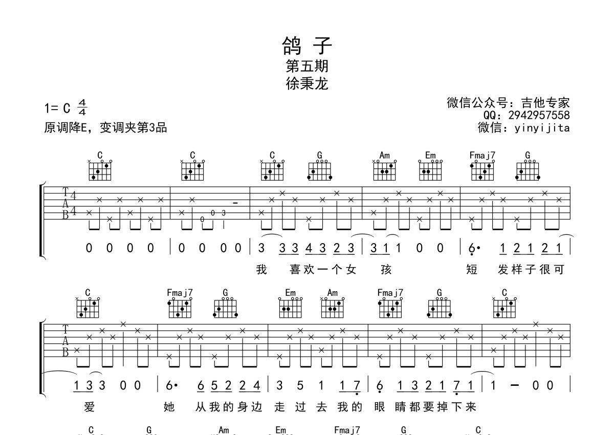 《鸽子》是徐秉龙演唱的一首歌曲,本吉他谱采用的是C调指法编配,这份吉他谱共有两张高清图谱,图谱由 @吉他专家 编配上传,图谱使用六线谱编配,包含吉他和弦指法、简谱以及歌词部分,使用这份鸽子吉他谱,可以让你更加方便地掌握这首歌曲的弹唱技巧,快来尝试吧。原调降E调,变调夹3品。