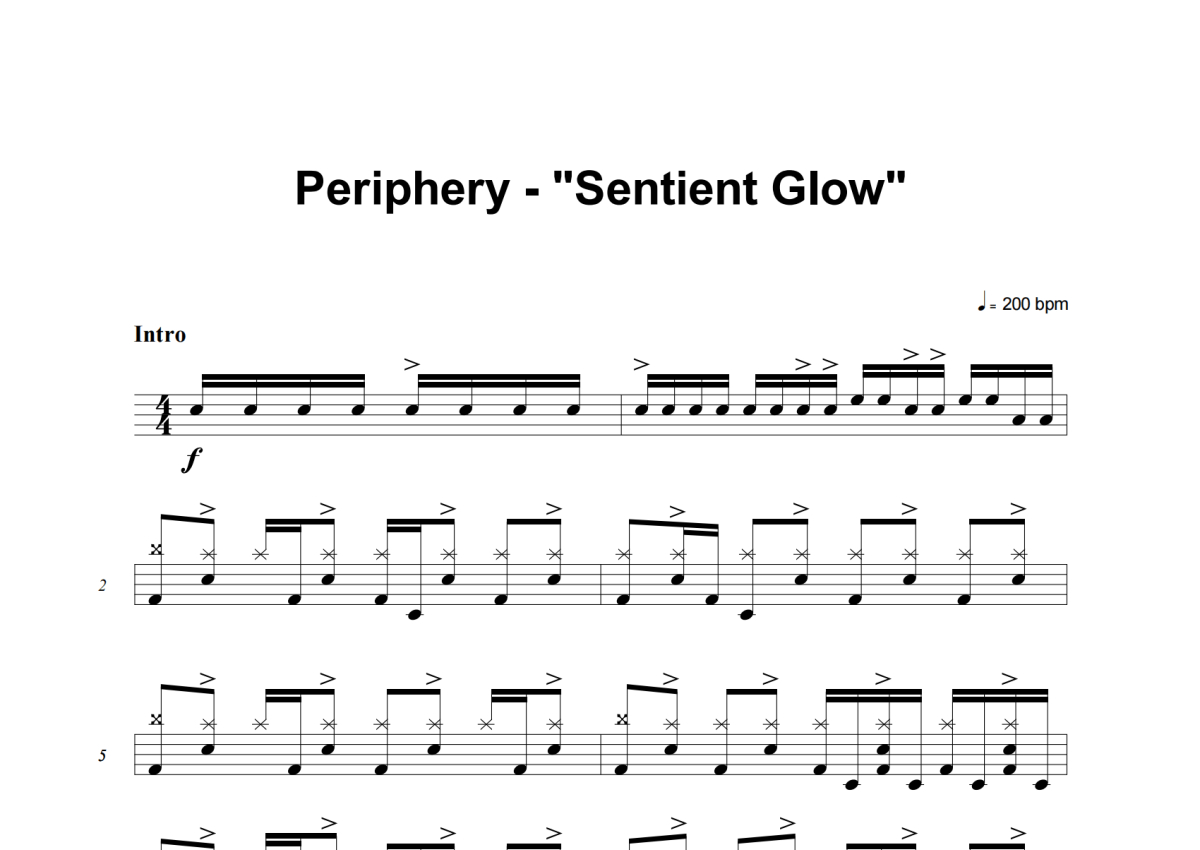 《Sentient Glow》是Periphery演唱的一首歌曲,这份架子鼓谱共有十张高清图谱,图谱由 @失眠的土豆 编配上传,图谱使用五线谱编配,使用这份Sentient Glow架子鼓谱,你将能够轻松地敲打出这首Periphery的Sentient Glow,快来尝试吧。