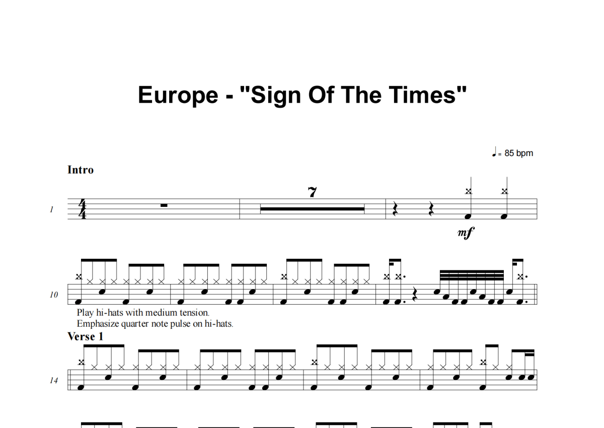 《Sign Of The Times》是Europe演唱的一首歌曲,这份架子鼓谱共有三张高清图谱,图谱由 @失眠的土豆 编配上传,图谱使用五线谱编配,使用这份Sign Of The Times架子鼓谱,你将能够轻松地敲打出这首Europe的Sign Of The Times,快来尝试吧。