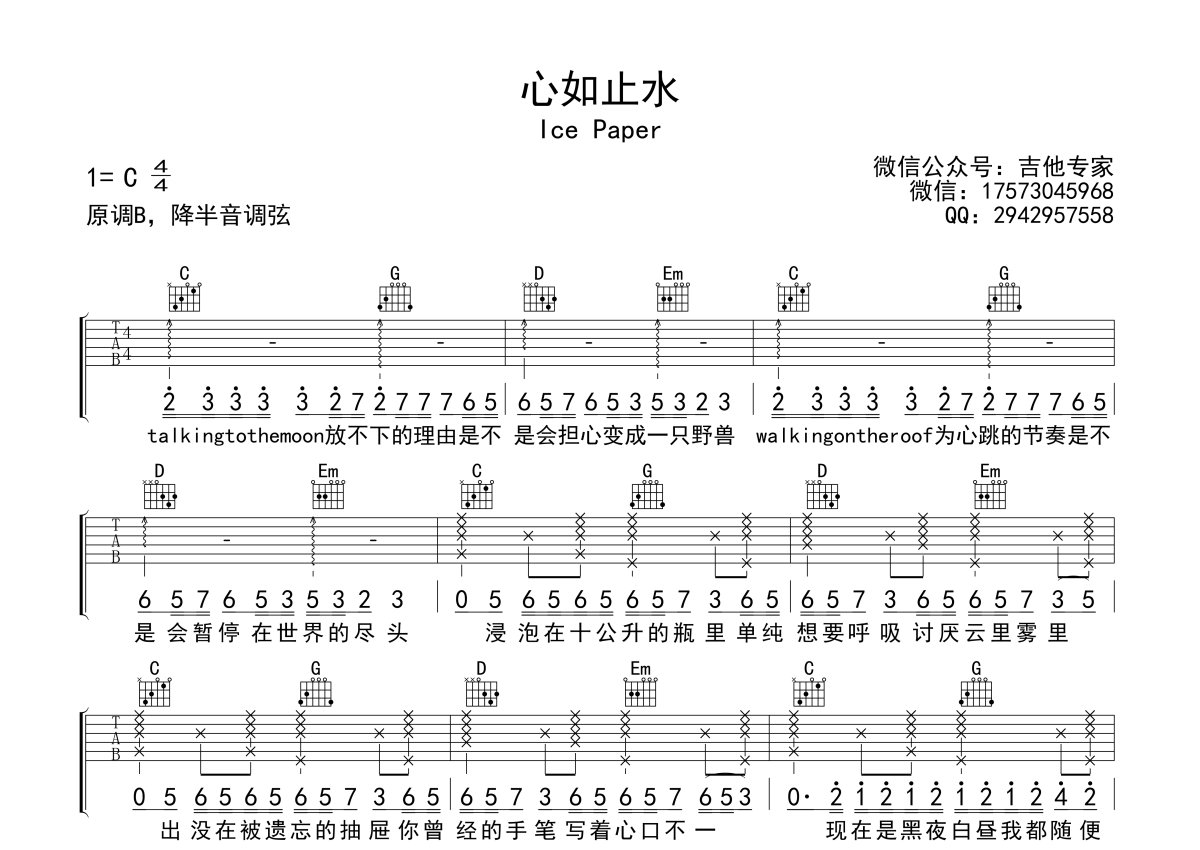 《心如止水》是Ice Paper演唱的一首歌曲,本吉他谱采用的是C调指法编配,这份吉他谱共有两张高清图谱,图谱由 @吉他专家 编配上传,图谱使用六线谱编配,包含吉他和弦指法、简谱以及歌词部分,使用这份心如止水吉他谱,可以让你更加方便地掌握这首歌曲的弹唱技巧,快来尝试吧。