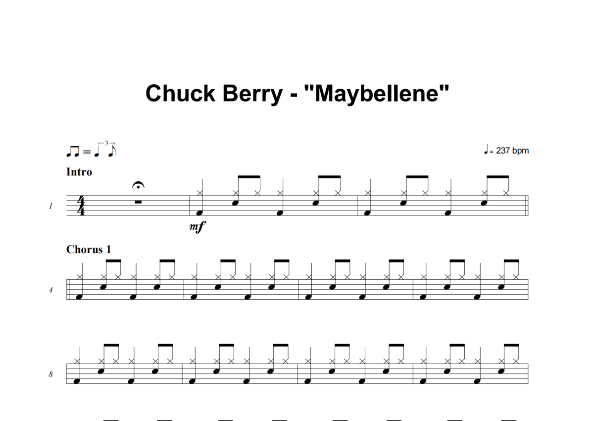 《Maybellene》是Chuck Berry演唱的一首歌曲,这份架子鼓谱共有四张高清图谱,图谱由 @失眠的土豆 编配上传,图谱使用五线谱编配,使用这份Maybellene架子鼓谱,你将能够轻松地敲打出这首Chuck Berry的Maybellene,快来尝试吧。