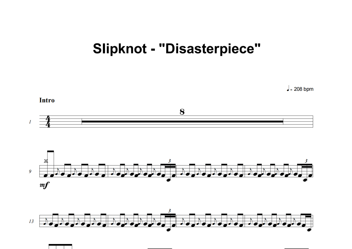《Disasterpiece》是Slipknot演唱的一首歌曲,这份架子鼓谱共有十张高清图谱,图谱由 @失眠的土豆 编配上传,图谱使用五线谱编配,使用这份Disasterpiece架子鼓谱,你将能够轻松地敲打出这首Slipknot的Disasterpiece,快来尝试吧。